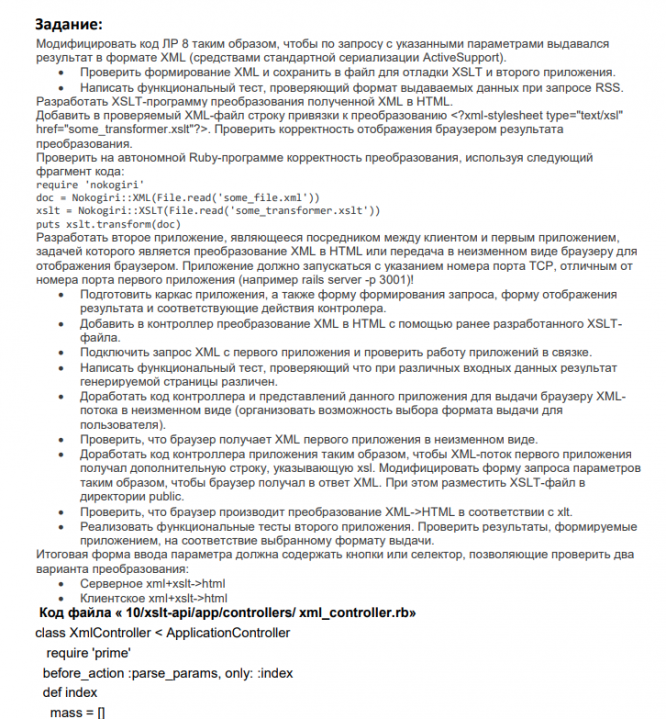Модифицировать код ЛР 8 таким образом, чтобы по запросу с указанными параметрами выдавался результат в формате XML (средствами стандартной сериализации ActiveSupport). Проверить формирование XML и сохранить в файл для отладки XSLT и второго приложения. Написать функциональный тест, проверяющий формат выдаваемых данных при запросе RSS. Разработать XSLT-программу преобразования полученной XML в HTML. Добавить в проверяемый XML-файл строку привязки к преобразованию . Проверить корректность отображения браузером результата преобразования. Проверить на автономной Ruby-программе корректность преобразования, используя следующий фрагмент кода: require 'nokogiri' doc = Nokogiri::XML(File.read('some_file.xml')) xslt = Nokogiri::XSLT(File.read('some_transformer.xslt')) puts xslt.transform(doc) Разработать второе приложение, являющееся посредником между клиентом и первым приложением, задачей которого является преобразование XML в HTML или передача в неизменном виде браузеру для отображения браузером. Приложение должно запускаться с указанием номера порта TCP, отличным от номера порта первого приложения (например rails server -p 3001)! Подготовить каркас приложения, а также форму формирования запроса, форму отображения результата и соответствующие действия контролера. Добавить в контроллер преобразование XML в HTML с помощью ранее разработанного XSLTфайла. Подключить запрос XML с первого приложения и проверить работу приложений в связке. Написать функциональный тест, проверяющий что при различных входных данных результат генерируемой страницы различен. Доработать код контроллера и представлений данного приложения для выдачи браузеру XMLпотока в неизменном виде (организовать возможность выбора формата выдачи для пользователя). Проверить, что браузер получает XML первого приложения в неизменном виде. Доработать код контроллера приложения таким образом, чтобы XML-поток первого приложения получал дополнительную строку, указывающую xsl. Модифицировать форму запроса параметров таким образом, чтобы браузер получал в ответ XML. При этом разместить XSLT-файл в директории public. Проверить, что браузер производит преобразование XML->HTML в соответствии с xlt. Реализовать функциональные тесты второго приложения. Проверить результаты, формируемые приложением, на соответствие выбранному формату выдачи. Итоговая форма ввода параметра должна содержать кнопки или селектор, позволяющие проверить два варианта преобразования: Серверное xml+xslt->html Клиентское xml+xslt->html